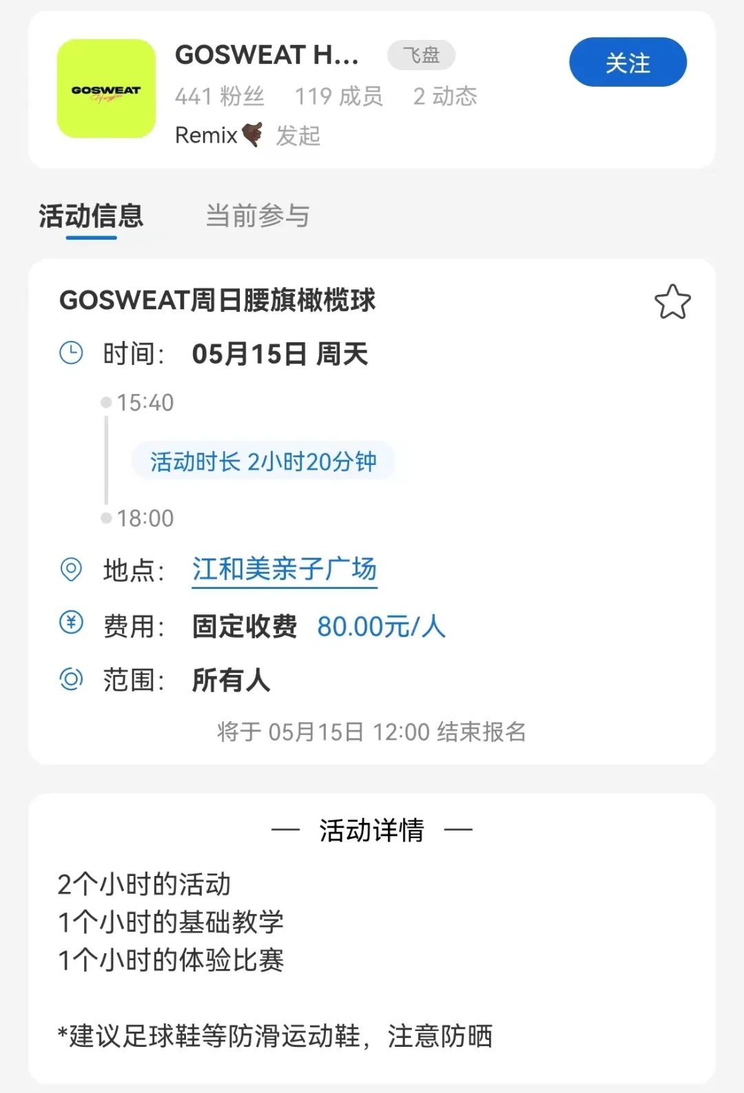 花上七八十元,就能快乐一个下午。/GOSWEAT 腰旗橄榄球活动报名截图相比于火爆一时的攀岩、潜水、滑雪等户外活动,在都市的方寸草地间便能寻得片刻撒欢的腰旗橄榄球,显然拥有更高的性价比以及可以快速回馈的成就感。