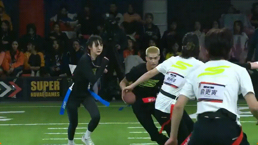 腰旗橄榄球的比赛阵营中不乏男女搭配的组合。/《超新星运动会》规则简单可以快速入门,避免身体接触和危险动作,“低门槛,弱对抗”成为腰旗橄榄球出圈的基础,“撕名牌”式的快感更让男女老少都能沉浸其中。