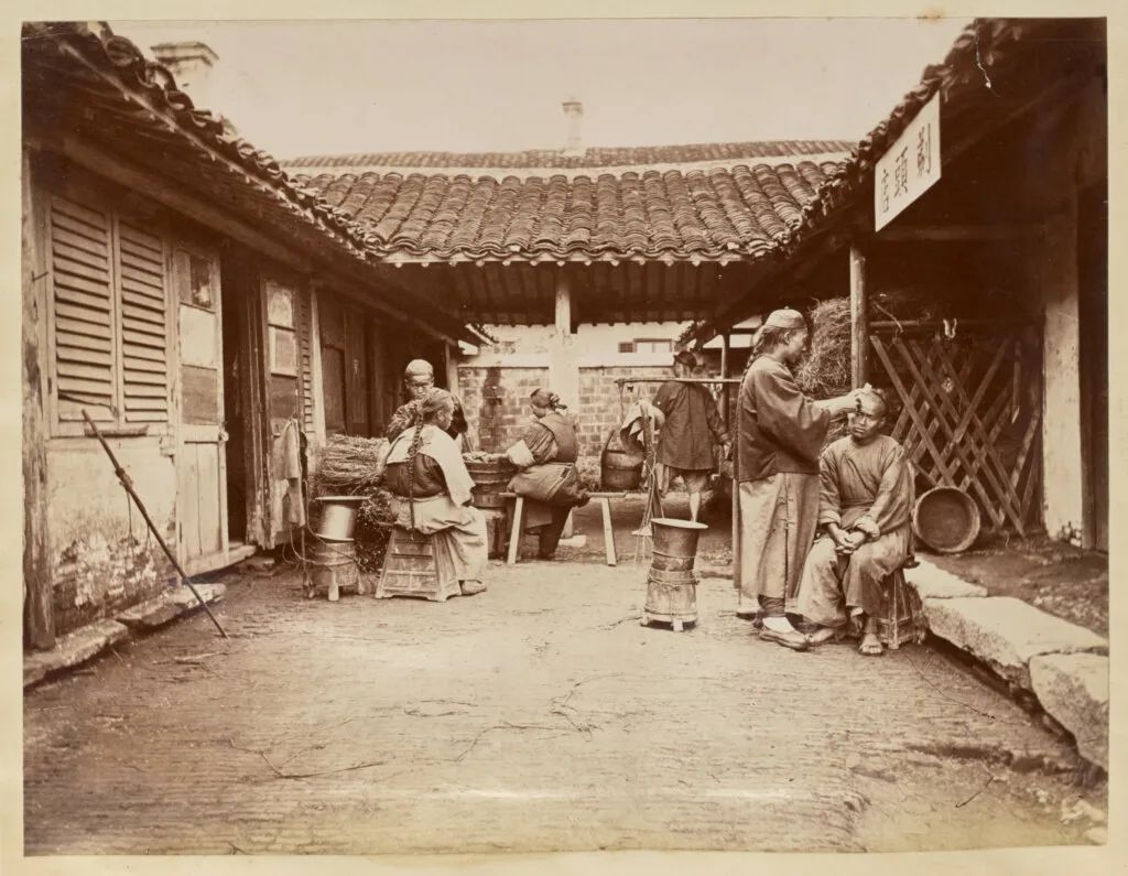 1870年前后,上海老城厢内的剃头店图片摄影 | Williams Saunders