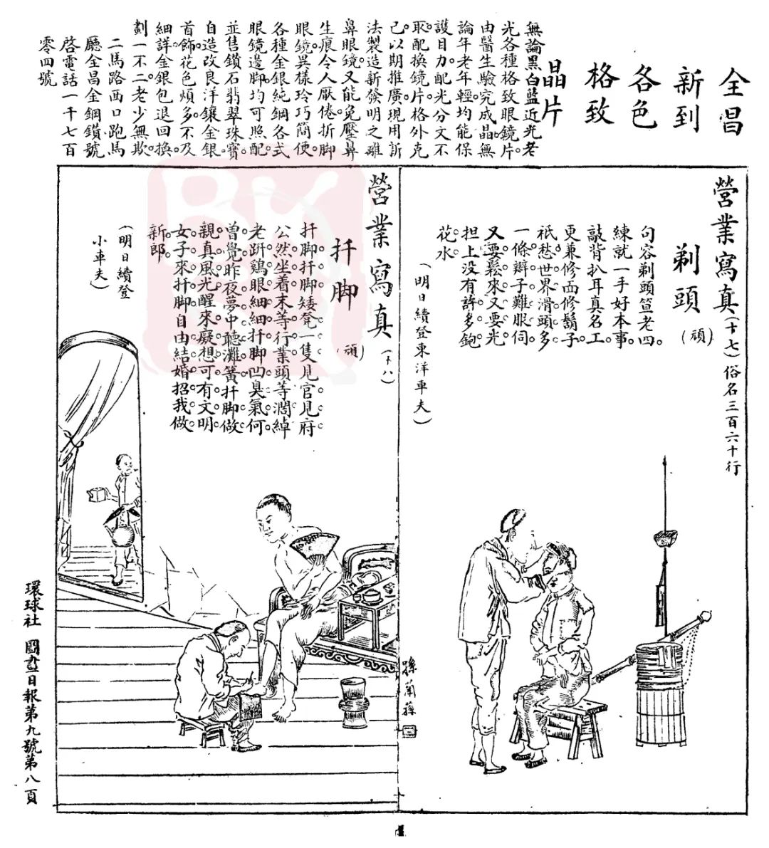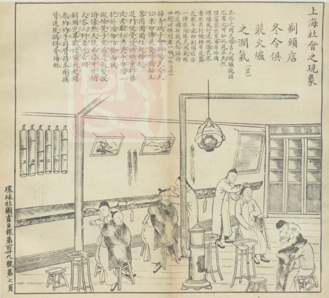 1909年、1910年上海刊印的《图画日报》中关于剃头的描绘上海理发行业在19世纪后期开始渐成气候,光绪二年(1876年)江苏丹徒人朱启鹤在虹口武昌路424号开设“升发剃头店”,光绪四年(1878年)戚财福在长治路203号开设“戚合记”剃头店,是较早华商开设的剃头店。光绪十三年(1887年),3位法国侨民在南京路19号开设“巴黎沙龙”理发店。