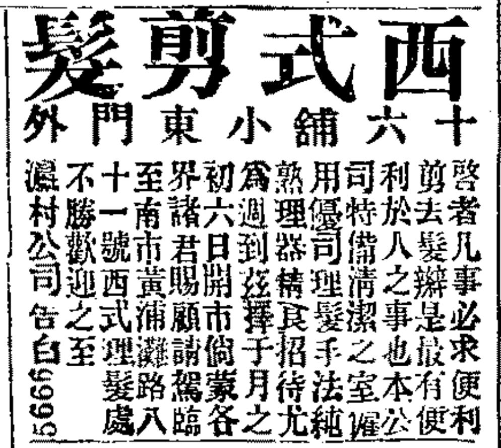 1911年12月24日《申报》刊发的一则西式剪发广告1911年辛亥革命,清朝封建统治被推翻,男子普遍剪辫留发,不仅原有的剃头店、摊改为理发店,又有归国华侨、华商和洋商开设理发店,街头巷里到处出现新开的理发店,使得上海的理发业从近代传统的剃头梳辫向现代的理发方向发展。不论在技术上,还是在发式上,都有较大的变化,这是“剃”向“美”的转化,也是行业历史上一次重大突破。由于1919年五四运动的影响,广大民众,特别是女性的思想意识和生活方式有了新的变化。女子普遍剪短发,理发店纷纷增加女子剪发业务,使理发业从为男宾服务转向为男宾、女宾同时服务。