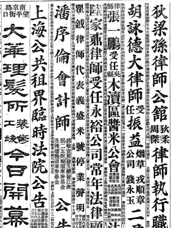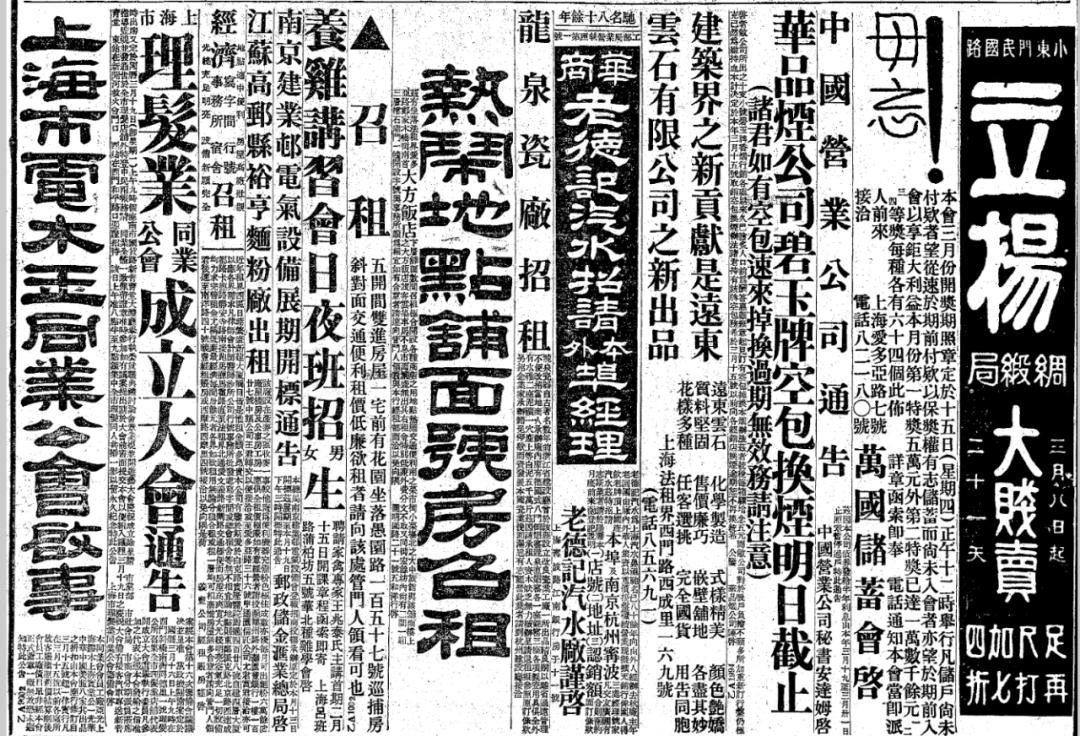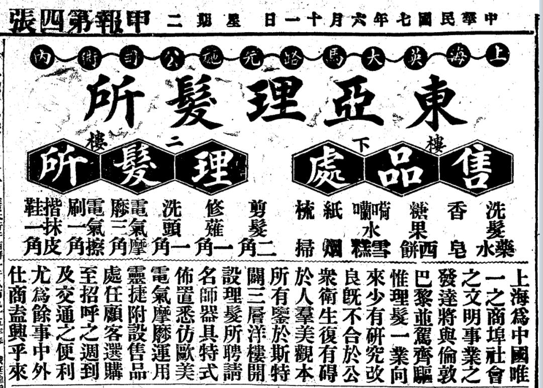 1929年5月30日《申报》刊发的“上海第一女子理发店”广告据《上海饮食服务业志》记载,抗日战争前后,上海共有理发店、摊二千余家,理发师万余人,其中高级理发店有200家,已具有相当规模。同时,理发业行业组织,上海市理发商业同业公会对行业内的管理进一步走向健全,行业经营等级分为特、甲、乙、丙4等,每等分为正、副2级,成为4等8级,由同业公会制订统一的分等级价目表收费。