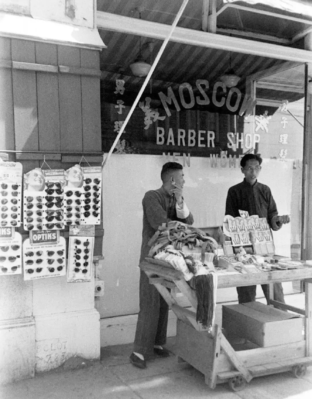1949年,林森中路857号华美理发店(Moscow Barber Shop),现今位置大约在淮海中路红房子西菜馆附近图片摄影 | Jack Birns