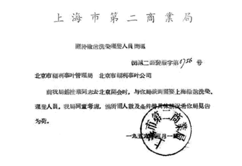 1956年,上海市第二商业局关于派送洗染理发人员赴京的公函