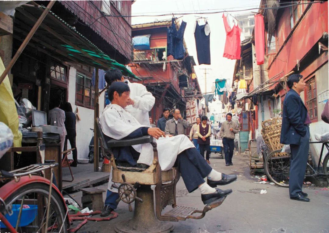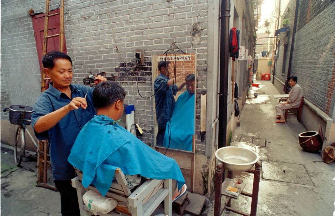 20世纪90年代,上海马路边、弄堂里的便民理发摊图片摄影 | 陆杰