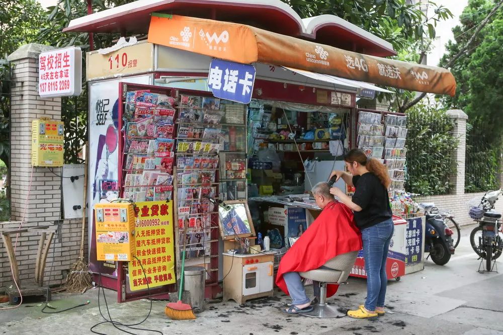 2016年6月,一家东方书报亭摊主在为顾客理发。网络发展,纸媒式微,书报亭搞起多种经营图片摄影 | 王溶江