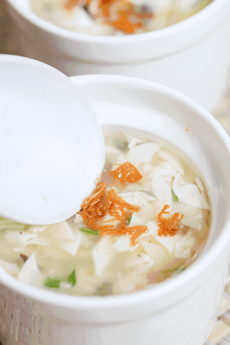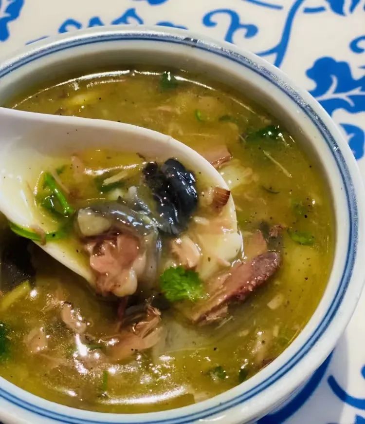 一是用鲫鱼脑和鸡汤调味,再加上鸡肉丁、香菇丁等一起烹制而成,这料熬什么都好吃。