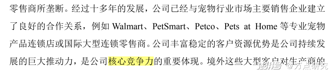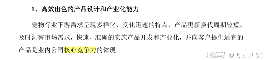 在源飞宠物招股书中搜索“核心竞争力”,找到对已有实力的表述并不多。分别是“高效出色的产品设计和产业化能力”、“丰富稳定的客户资源优势”、“设计与创意作为产品的核心竞争力。”显然,这些表述过于泛化。
