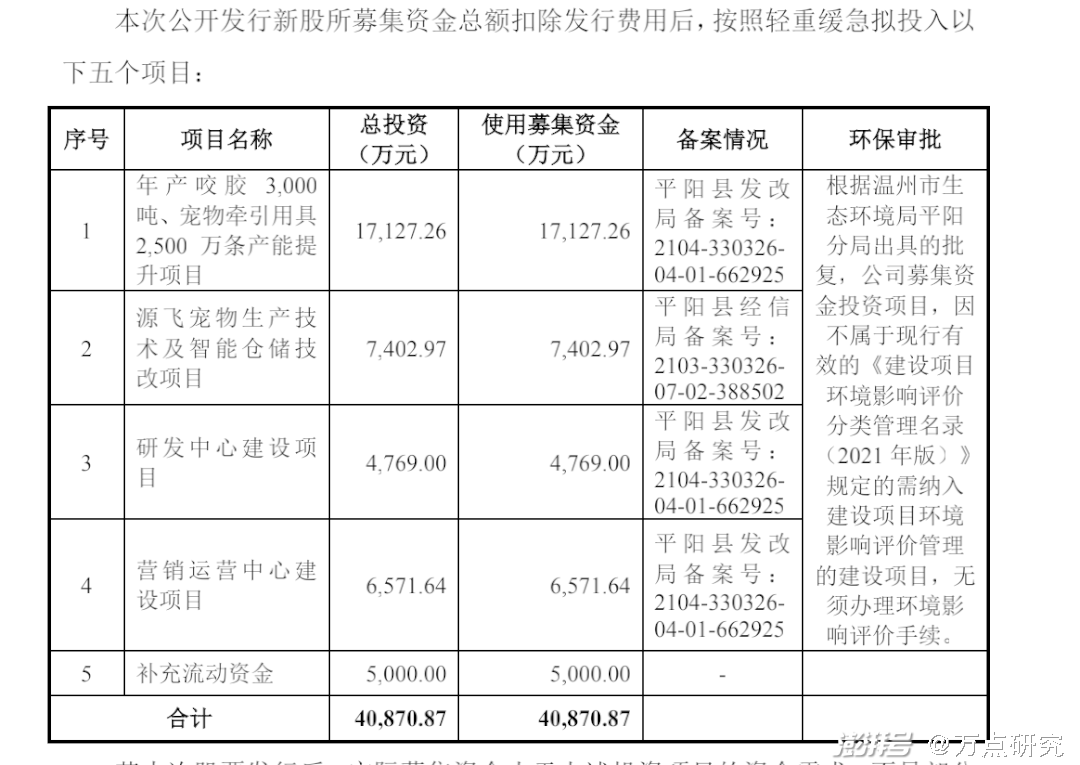 招股书中募投项目的相关表述亦令人玩味。招股书中产能提升项目并未没有说明具体建设地址,只表示“拟购置位于宠物小镇的33.3亩土地”。招股书显示本项目总投资1.71亿元,其中建设投资1.47亿元,占比85.85%;铺底流动资金和预备费2423.08万元,占比14.15%。关于该项目的土地使用权证、环评文件在招股书中亦未见披露。