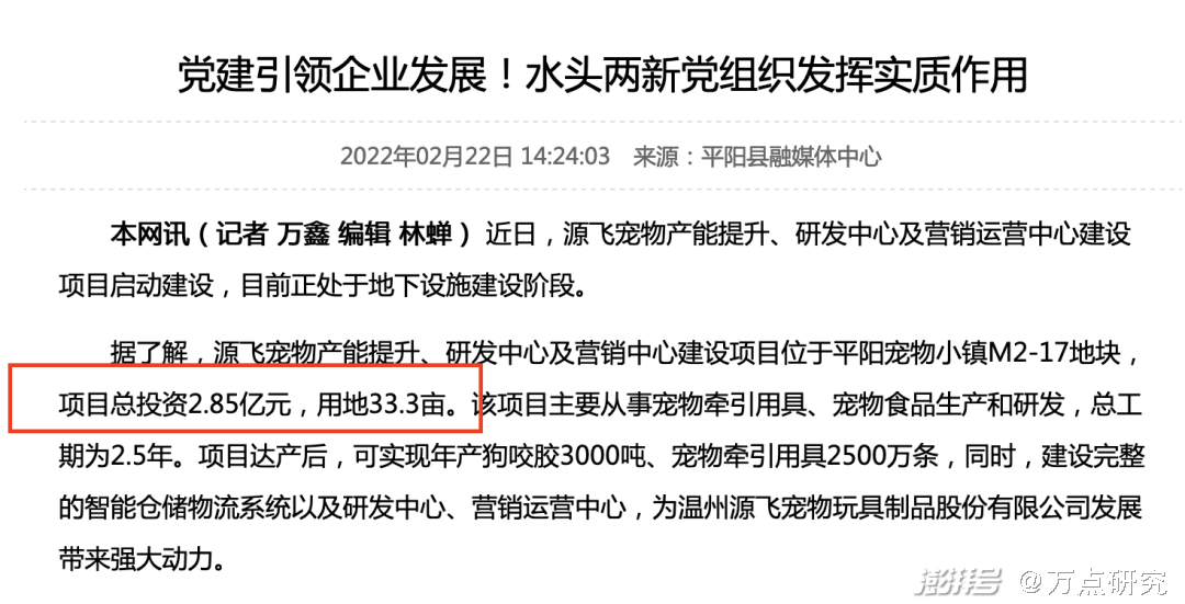 对照之下,平阳县融媒体中心2月22日的报道中显示,“源飞宠物产能提升、研发中心及营销中心建设项目位于平阳宠物小镇M2-17地块,项目总投资2.85亿元,用地33.3亩。”