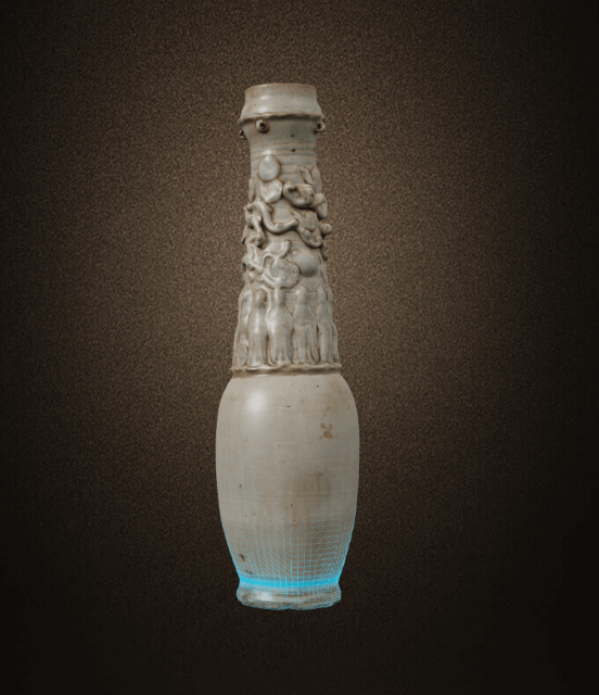 此件为南宋时期的堆塑瓶,是一种随葬明器,其瓶颈堆塑着日月祥云、龙纹、鸟、犬、蛇、龟、仙佛人物以及十二时俑等纷繁复杂的装饰题材。