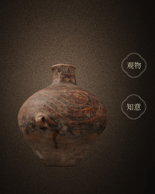 新石器时代中晚期,黄河流域的彩陶文化大放异彩。黄河上游甘青地区的彩陶在造型、纹饰、画风等方面均富有浓郁的地方特点。此件彩陶壶是马家窑文化半山类型的典型器,其腹部膨圆,肩及腹部主题纹饰用红黑两彩绘旋涡纹四组,旋涡纹内为“十”字纹,旋涡连线边缘饰细密的锯齿纹,锯齿纹是马家窑文化半山类型的标志性特征。