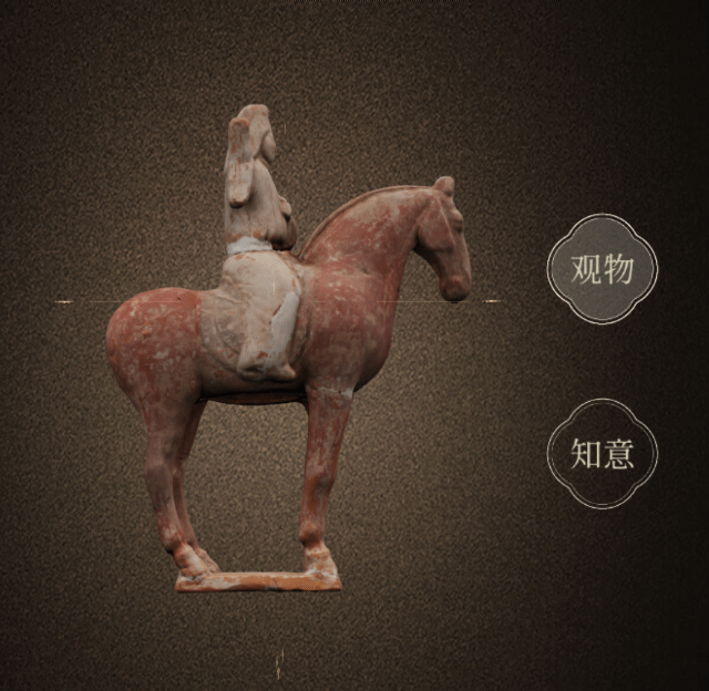 此为专门陪葬的仪仗俑。仪仗俑象征墓主人生前出行的仪仗队伍,先秦时期就已有之,一直延续到明清时期。仪仗俑通常包括武士俑、官吏俑、肩舆俑、持各类仪仗俑、乐俑、侍俑、骑马俑等,仪仗俑的随葬数量一般与墓主人的身份相关,有几件到上千件不等。这件彩绘骑马俑头戴风帽,为胡人形象,展示了唐代兼容并蓄的文化面貌。