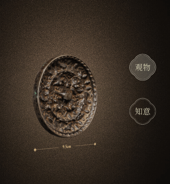镜质地泛白,伏兽钮。镜背分为内外两区,内区为4只追逐嬉戏于葡萄叶蔓之间的海兽,外区为一周环绕飞翔于葡萄枝蔓之间的鸟雀。唐代是铜镜发展史的另一个高潮,海兽葡萄纹是唐代中期极为流行的一种铜镜纹饰,海兽葡萄纹铜镜是唐代铜镜铸造技艺鼎盛时期的代表性产物。中原地区原不产葡萄,汉代时通过“丝绸之路”由西域传入,海兽葡萄纹铜镜,展示了东西文化的交流和碰撞。
