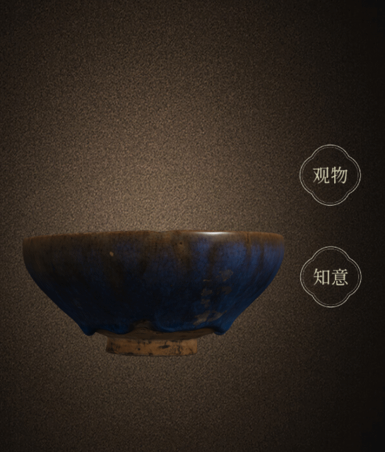 敛口、深腹、圈足,釉色凝固莹润,器表施天蓝色釉,器底无釉,露出胎色呈黄铜色。钧窑与汝窑、官窑、定窑、哥窑并称中国五大名窑,位于河南省禹州市,兴于唐,到北宋晚期达到鼎盛,金元继续发展。钧窑系瓷器釉色千变万化,有茄皮紫、海棠红、天蓝、月白等颜色。此件钧窑盏为元代钧窑的民窑产物,元代很多钧窑系民窑大量生产日用瓷器,这类瓷器胎质较粗松,积釉肥厚,器型一般较为厚重。