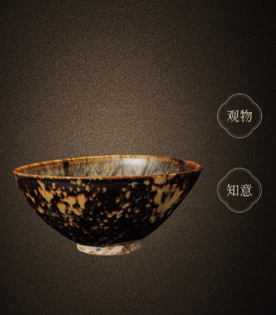 剪纸贴花是江西吉州窑独创的一种装饰手法,即在黑釉碗的内壁有对称排列的剪纸图案,剪纸图案部位与周围颜色不同,系两次施釉而成。该盏内壁以剪纸贴花的形式,对称地贴印有两只飞凤和两朵小花,画面构图舒朗均匀,飞凤舒展活泼,具有强烈的民间生活气息。