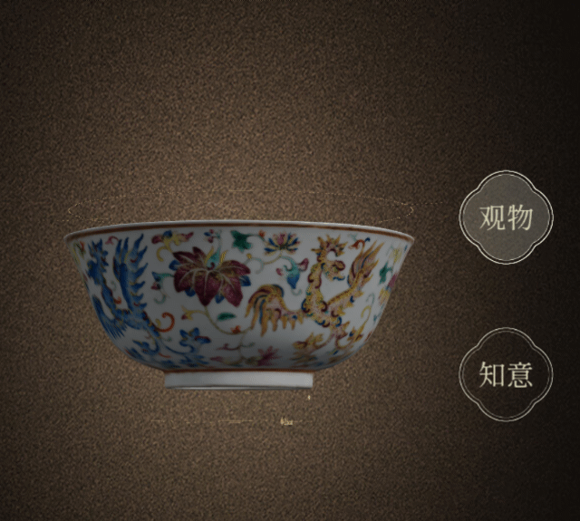 粉彩是在五彩的基础上,结合中国画的技法发展而成的低温釉上彩。从施彩的方法来看,先在素胎上勾出图案的轮廓,并在轮廓内填上一层“玻璃白”色料,再在玻璃白上堆填色料,用干净的笔轻轻地将颜色渲染成深浅不同的层次,这相当于中国画中的没骨画法。这件碗的外底用青花书有“大清同治年制”,内壁施白釉,外壁通体绘有三条夔凤纹,夔凤纹之间装饰有缠枝花卉,具有祥瑞吉庆的美好寓意。