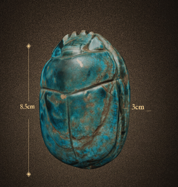 这件文物是清朝官员端方于1906年从埃及开罗带回中国的古埃及阿蒙霍特普三世时期(公元前1390—前1352年)的纪念性圣甲虫雕饰,其腹部刻有古埃及象形文字铭文,铭文以“法老的胜利”为主题,记录了阿蒙霍特普三世时期的重大历史事件,彰显了阿蒙霍特普三世至高无上的权威,具有印章、护身符等功能,象征着王权的永恒和新生命的复活。该雕饰是中国现存为数不多的古埃及文物,不仅具有较高的学术价值,在收藏史上也具有特殊的地位。