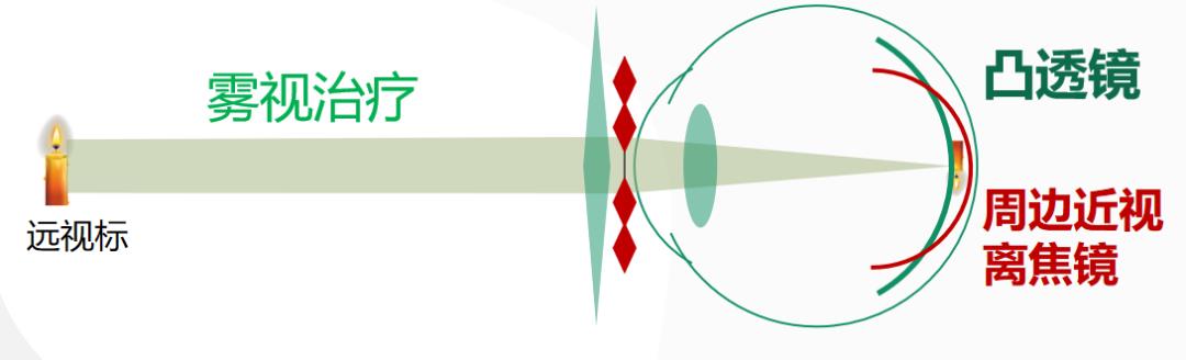 上图展示的是一个不近视的孩子成像效果,对于已经近视的孩子,戴上自己的近视镜,整体上就相当于一个正常视力的眼睛。计算好雾视量,再加到自己的眼镜里面就可以了。