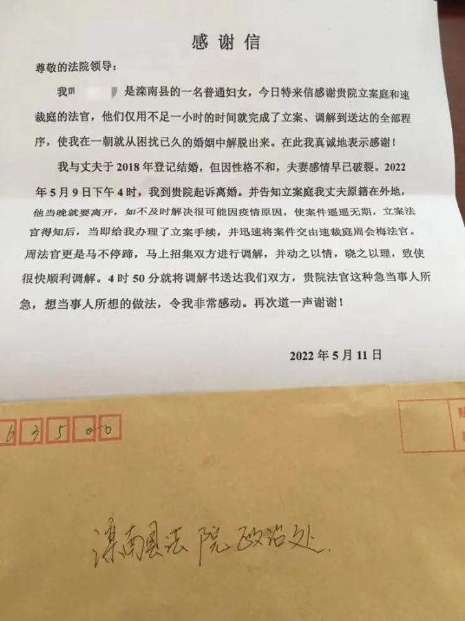 原标题:《纸短情长——“走心”的感谢信送给“用心”的滦南法院人》
