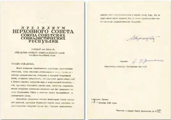 上图:中国驻苏联大使王稼祥(前排左三)在我国驻苏使馆门前合影。下图:新中国第一份国书。1965年我调入礼宾司时,国书制作已经规范化。可以说,礼宾司人人都是国书制作的能手。上级书面通知下达后,按一定格式填写国书内容,并登记编号,送司长审批后,即送外交部办公厅文印处印制。印制毕即上呈国家主席签署,外交部部长副署。