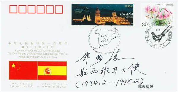 中国驻西班牙大使宋国清在中华人民共和国-西班牙共和国建交三十周年纪念封上签名。圣马力诺是世界上最小、最古老共和国之一,圣马力诺执政官即是国家元首、政府和大议会首脑,由两人共同担任,权力相等。接受外国使节国书时,两位执政官都必须在场。