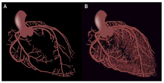 由前小动脉、小动脉构成的冠脉微循环造成了冠脉循环80%的阻力。你以为的冠脉循环也许是下图(A)的样子,但实际的冠脉循环由心外膜下冠脉和冠脉微循环共同构成,长下图(B)这样。