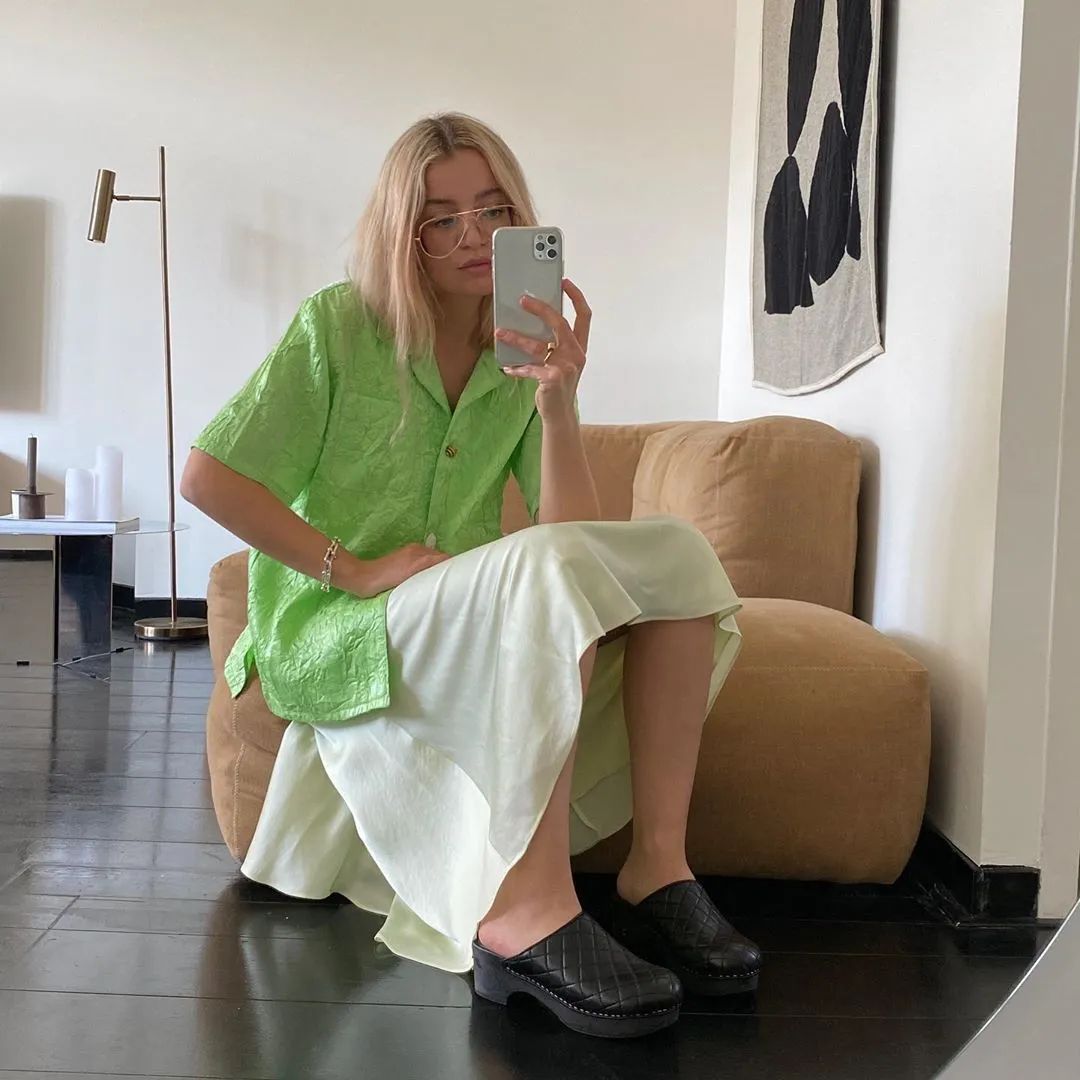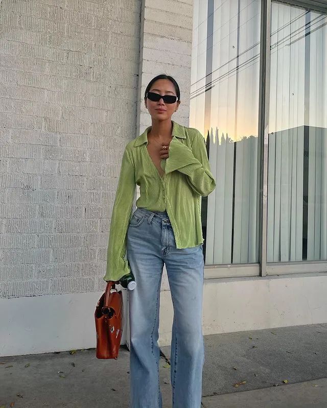 暖黄皮girl上身这种荧光绿的衬衣,下搭浅色系中和一下整体的明亮度,分分钟显白一个度。