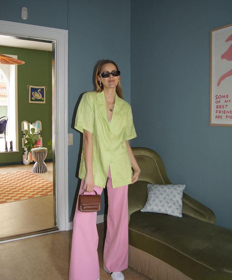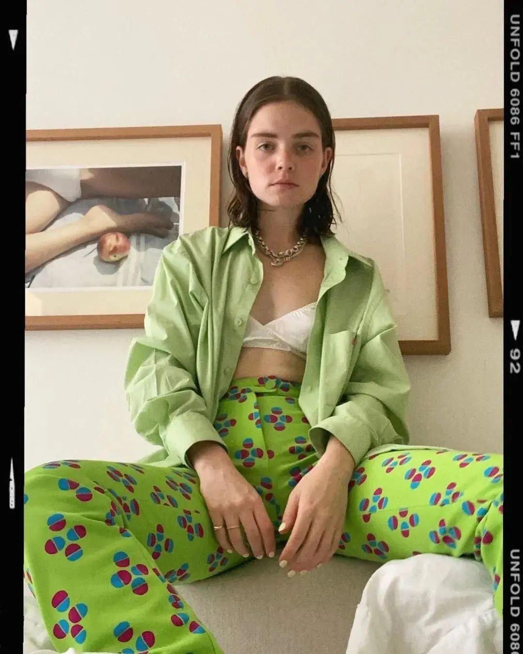 oversized的柠檬绿衬衣,搭配柔粉色的休闲裤和小白鞋,简单随性又chic~
