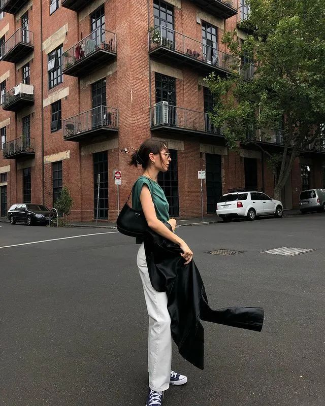 夏天all white的造型显得有些沉闷,有了绿色包包的加持,时尚感upupup!