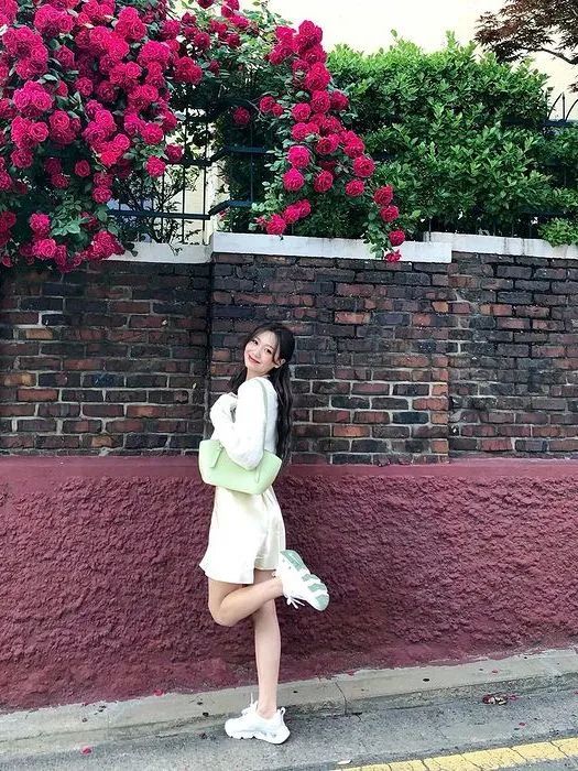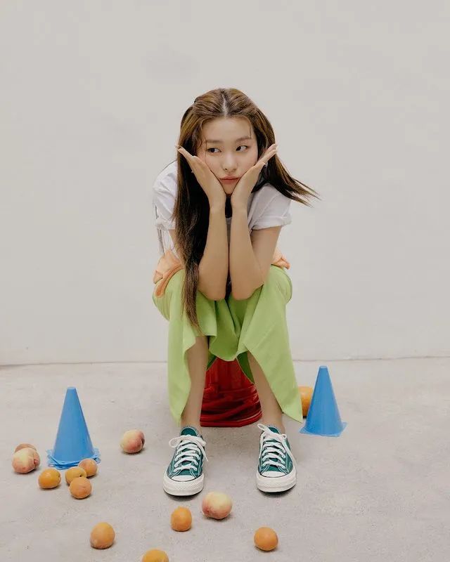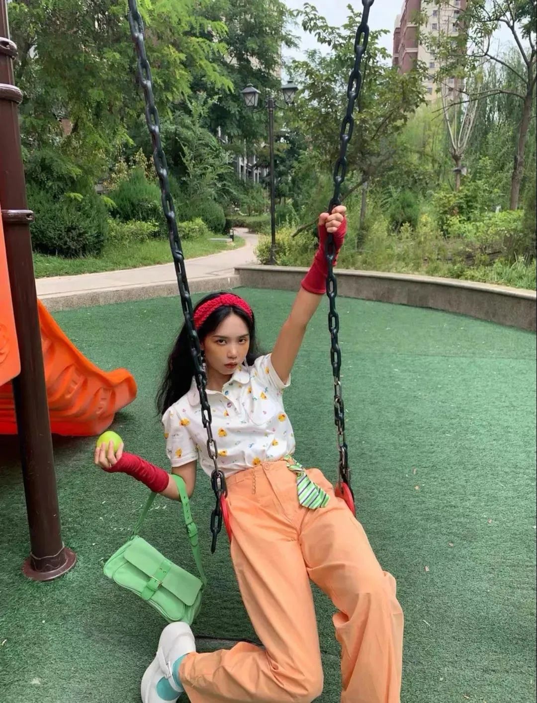 韩智贤整体偏橘调的装扮,添加一点绿色元素的包包、飘带,实在太诱人了,夏日少女感涌现。