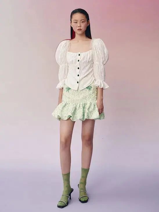 SUMMER还有泡泡袖的绿上衣,随意搭配一条丹宁牛仔,更显利落清爽~