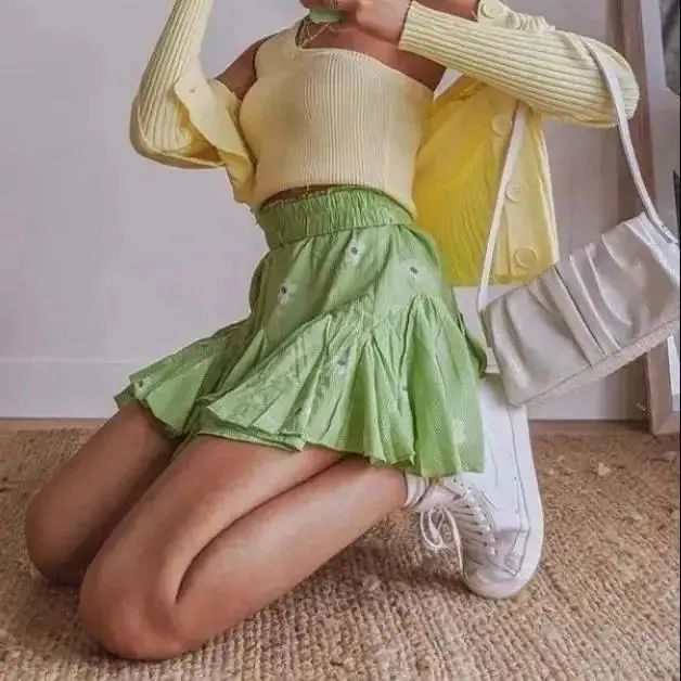 绿油油的A字阔腿短裤撞上甜美的柔粉crop top,秒变好莱坞荧幕女主角~