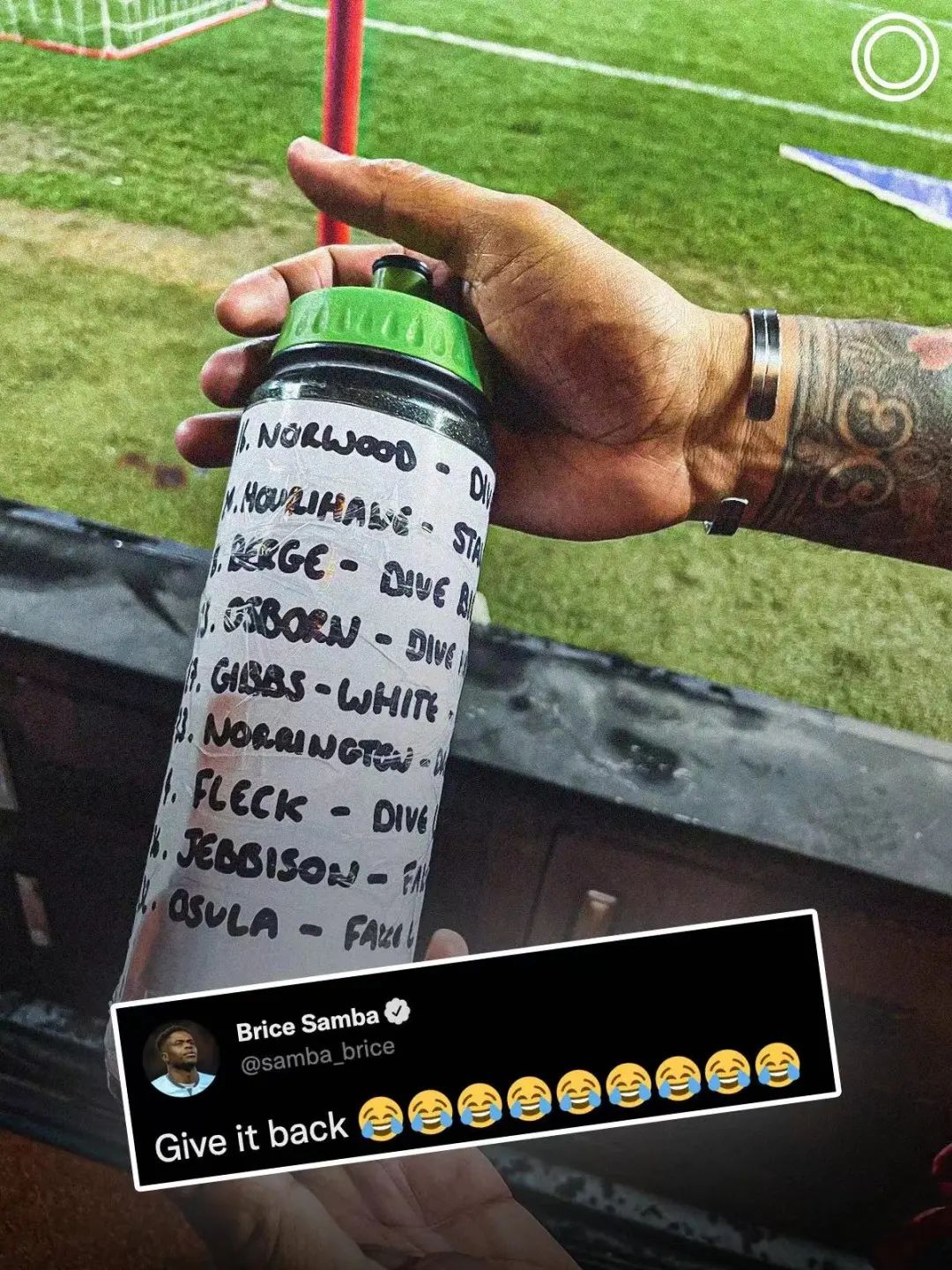 作为球队的英雄,人们是如何发现桑巴扑点的秘密?就在其扑出对手的点球赢得胜利之后,主场球迷近乎疯狂般地冲入球场与球队欢庆,有球迷随后在他的水壶上发现了这一秘籍,在这一番认真的“功课”背后或许也注定了诺丁汉森林将要踏上前往温布利大球场进行决赛的道路。