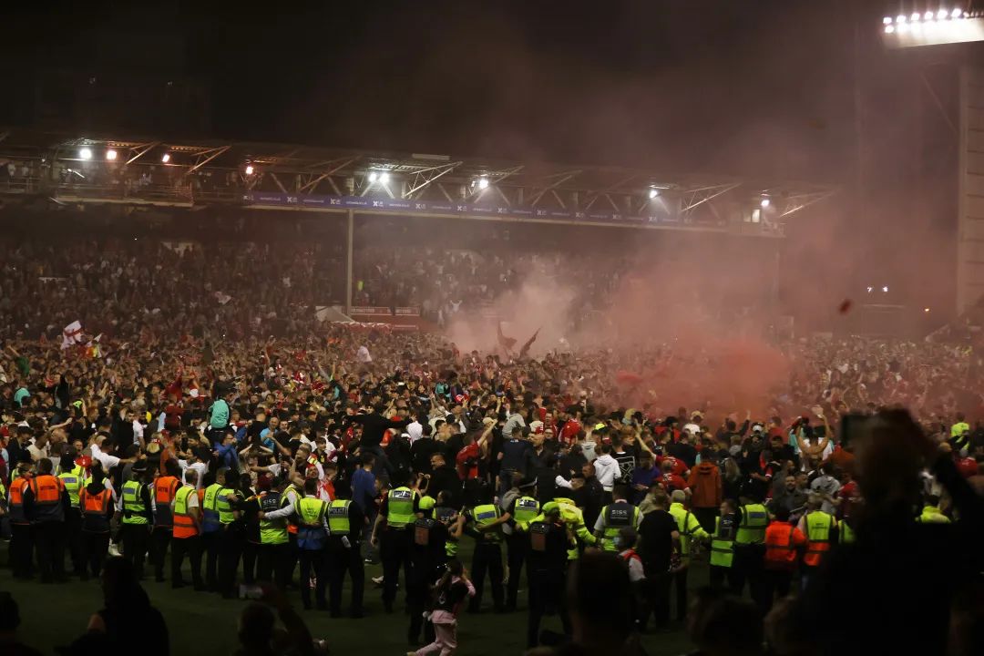 作为英足总1992年创立英超联赛的22支球队之一,诺丁汉森林在第一个赛季就以联赛最后一名惨遭降级,随后几年球队在英超和英冠之间反复横跳,直至1998-99赛季之后就再也没有回到过英超联赛,至今已经过去了整整23年的时间。要知道他们此前并非没有冲入英超的机会,只可惜在2010-11赛季的附加赛半决赛,他们最终被斯旺西挡在了附加赛决赛门外,距今也已经过去了整整11年,或许我们也不难理解球迷冲入球场的疯狂举动,毕竟他们距离重回英超只剩下了最后90分钟了。