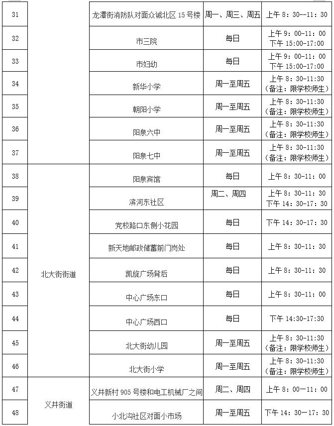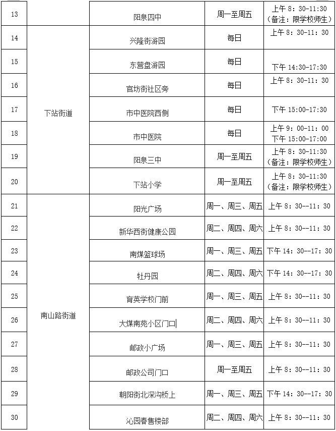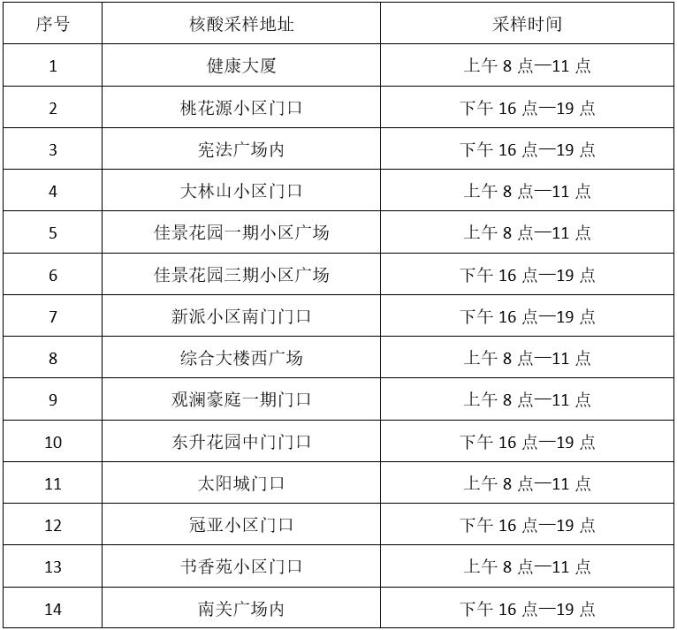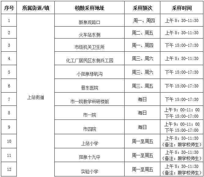 根据阳泉市新冠肺炎疫情防控工作领导小组办公室通告(第39号),为做好常态化新冠病毒核酸检测工作,结合我区实际,现将城区内设置的便民核酸采样点(亭)及采样时间公布如下:
