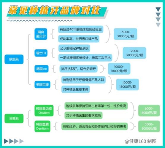 种牙那么贵,和本身使用的种植材料有关系,不同品牌材料价格差别很大。现在主流的种植牙品牌,大致分为欧美系和日韩系,具体可以看小编下面整理的这张图: