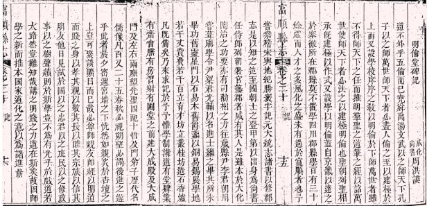 乾隆二十五年《富顺县志·艺文》载周洪谟《明伦堂碑记》通过进一步细查富顺旧志,发现周洪谟尚有《明伦堂碑记》(又名《重修明伦堂记》)一文得以刊存保留。一直以来,明伦堂是富顺文庙的重要组成部分,专供读书、讲学、论道之用,历代富顺主官都重视其修缮管理。明成化年间,先后有山东籍知县李嵩(字朝用)、江西籍知县梁文(字光辅)对文庙及明伦堂进行整修。特别是梁知县,先“修明伦堂,展学地十丈,造石香炉等”,后专门拜请尚书周洪谟为其作记。当然了,向来尊孔崇儒并视教育“有禆风教”且“以正人心”的周洪谟欣然应允。他在《明伦堂碑记》中交代了写作此文的背景:“往岁,县尹李君朝用尝葺庙学,令尹梁君光辅以名进士继之,毕其所未毕。旧棂星门以石易木,旧爵盏以铜易锡,展学地若干丈,资费若干百,立育才坊,立丛桂坊,造石香炉,凡既备矣,乃来求记于予。”