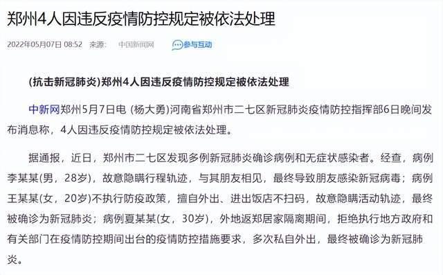 ■ 2022年5月4日,河南濮阳市在核酸检测时发现3名无症状感染者,均为濮阳医学高等专科学校学生。经查,共有6位学生偷偷翻墙外出,去往烤肉店用餐、在商业街逛街,约8小时后返校。疫情发生后,立即组织人员开展流行病学调查、区域封控、消毒消杀等工作,同时对排查出的密接、次密接严格落实集中隔离医学观察措施。