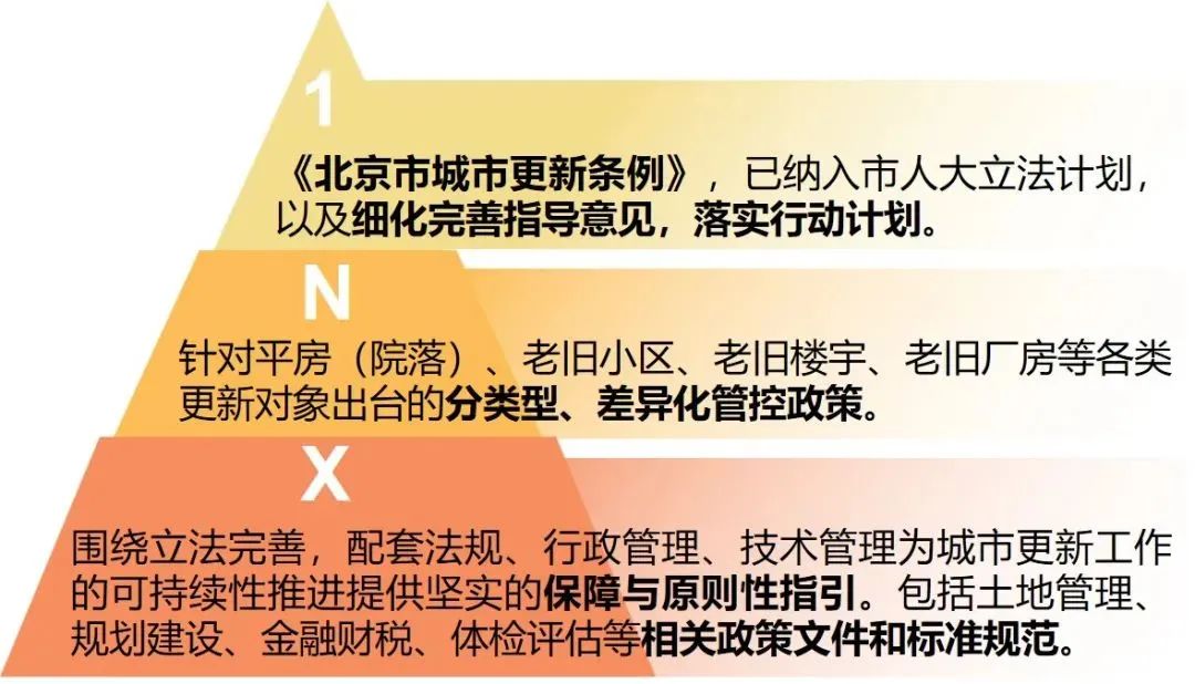 健全城市更新政策体系,统筹研究规划土地、金融财税、经营管理等方面的配套政策及标准规范,推进城市更新立法工作,形成城市更新“1+N+X”系列文件。重点解决更新领域广泛关注的使用权出让年限、建筑使用用途转换、建设用地功能混合、更新项目准入退出机制等瓶颈问题。加强市区两级协同联动,建立“政府统筹、条块协作、部门协同、分层落实”放管衔接联动服务的工作机制,推进项目的统筹协调和组织实施。通过城市更新成效评价,持续推动政策升级,形成更新实施评估与政策体系完善的良性互动。