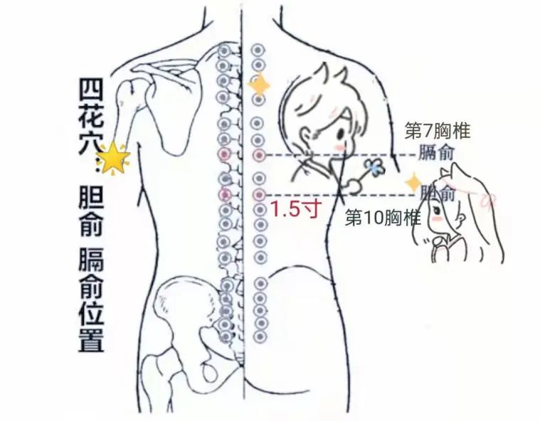 胆俞:两肩胛下角连线横平第七胸椎,再往下数分别为第八、第九、第十胸椎。后正中线距离肩胛骨内缘3寸,一半是1.5寸。第十胸椎旁开1.5寸就可以找到胆俞。