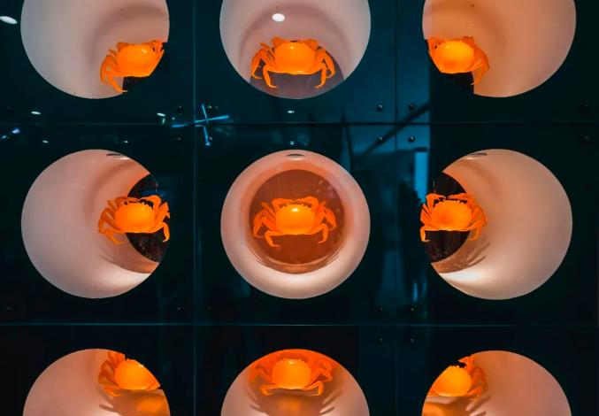 跟着蟹笼继续在水上漂啊……“这里居然有小螃蟹!”只听得一声惊呼,原来是螃蟹们要“爬”出来活动活动了。周边以螃蟹吐泡泡为灵感,设计了多媒体气泡球,营造出一个艺术、动态、多彩的蟹体验空间。