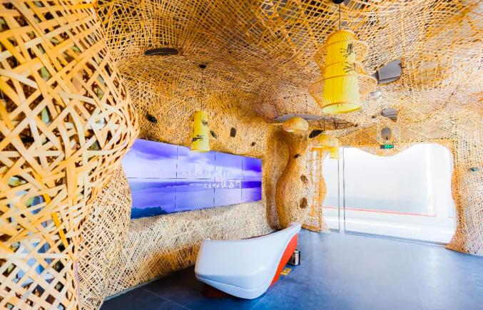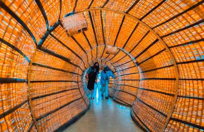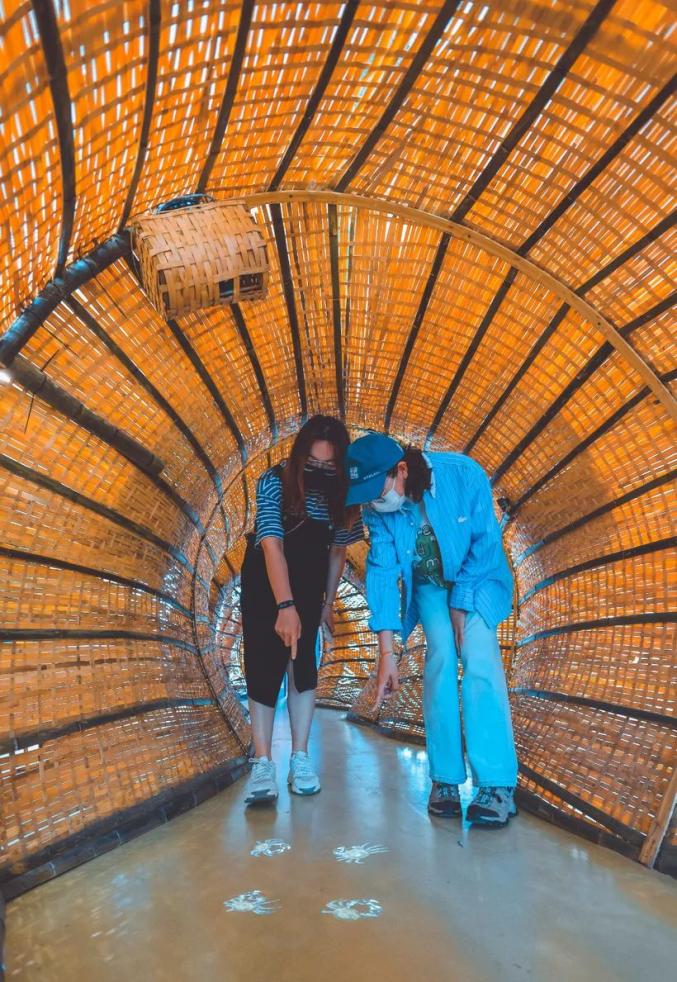 行走于此,着实体验了一把大闸蟹的生活,随着蟹群一起在蟹笼中漂浮、攀爬、停驻。竹子生态艺术装置屏风,更显竹林幽深意境,竹屏上,历代名人题咏螃蟹的诗句点缀其间。没错,大闸蟹之旅,从这里开始了。