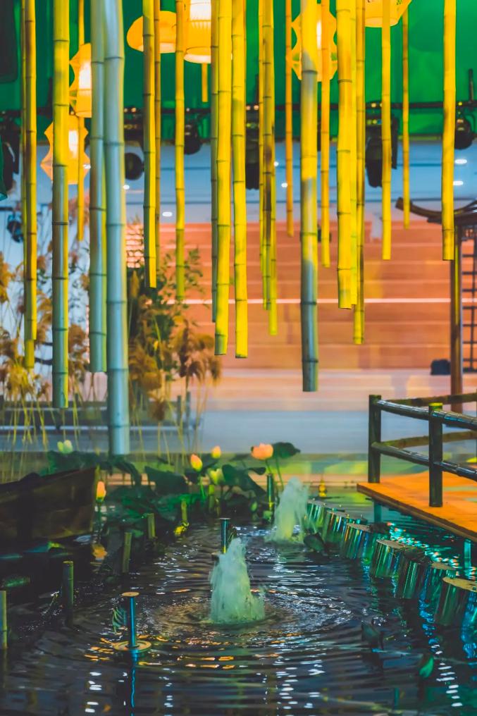 月影朦胧、芦苇摇曳,就这样跟随蟹笼一起漂入阳澄湖中……无数条动感数控水帘自上而下,结合水雾投影到艺术大闸蟹身上,四周和顶部多维展现了阳澄湖从清晨到黑夜,渔灯点点、月影朦胧的自然景象。