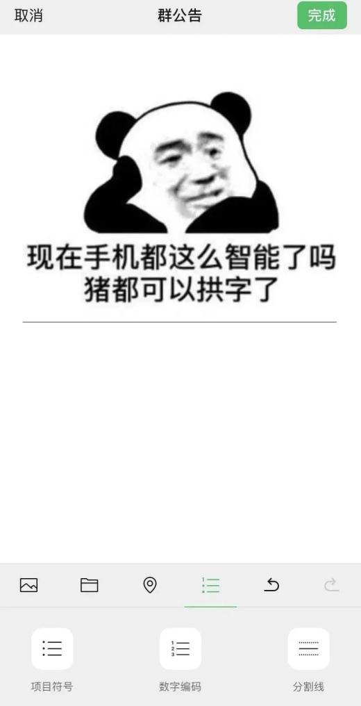 群公告支持插入图片、文件、位置,同时还支持排列符号和分割线。