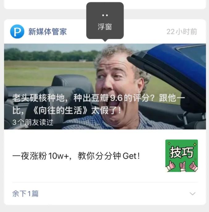 长按订阅号消息变化在订阅号消息中,长按推送文章会出现「浮窗」按钮,不用点进文章就可以快速设为浮窗。