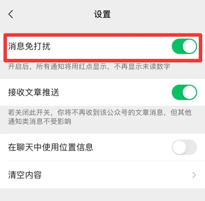 这次更新,只需要去任意的服务号中打开「消息免打扰」,所有关注的服务号都会关闭提醒。