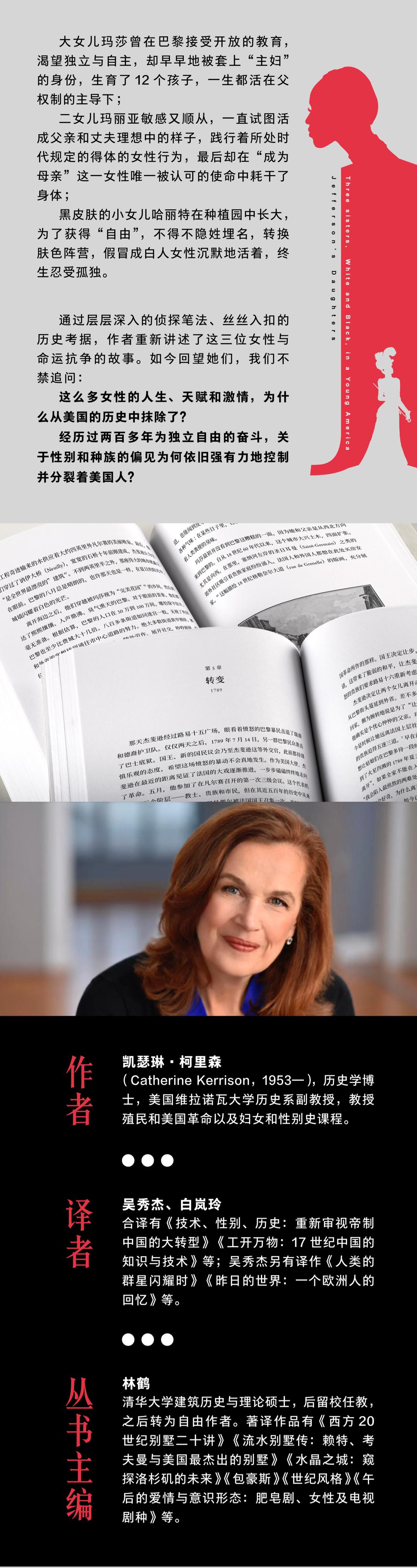 在“A纪实”译丛的第一本书《白与黑:国父的女儿们》中,历史学者凯瑟琳·柯里森向我们讲述了美国总统杰斐逊的三个女儿与命运抗争的故事。