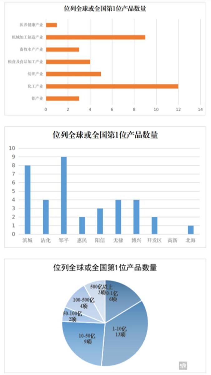 从地理看,它们在各县市区分布广泛,尤以滨城、邹平为多。在产品产量或市场占有率位列全球第1位的4项中,滨城区2项、邹平市2项;产品产量或市场占有率位列全国第1位的33项,涉及7个县市区、2个市属开发区,其中滨城区6项、沾化区4项、邹平市7项、惠民县2项、阳信县3项、无棣县4项、博兴县4项、滨州经济技术开发区2项、北海经济开发区1项。