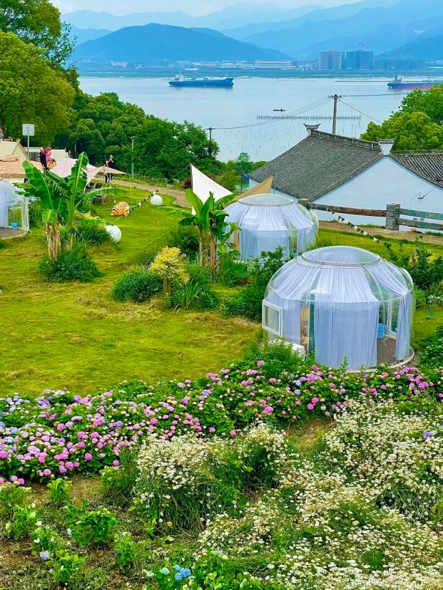镇海秦山村临湖书吧露营地、宁波珞桐艺术帐篷营地、永旺村四季花海、桃花岭古道、沿江路灯塔